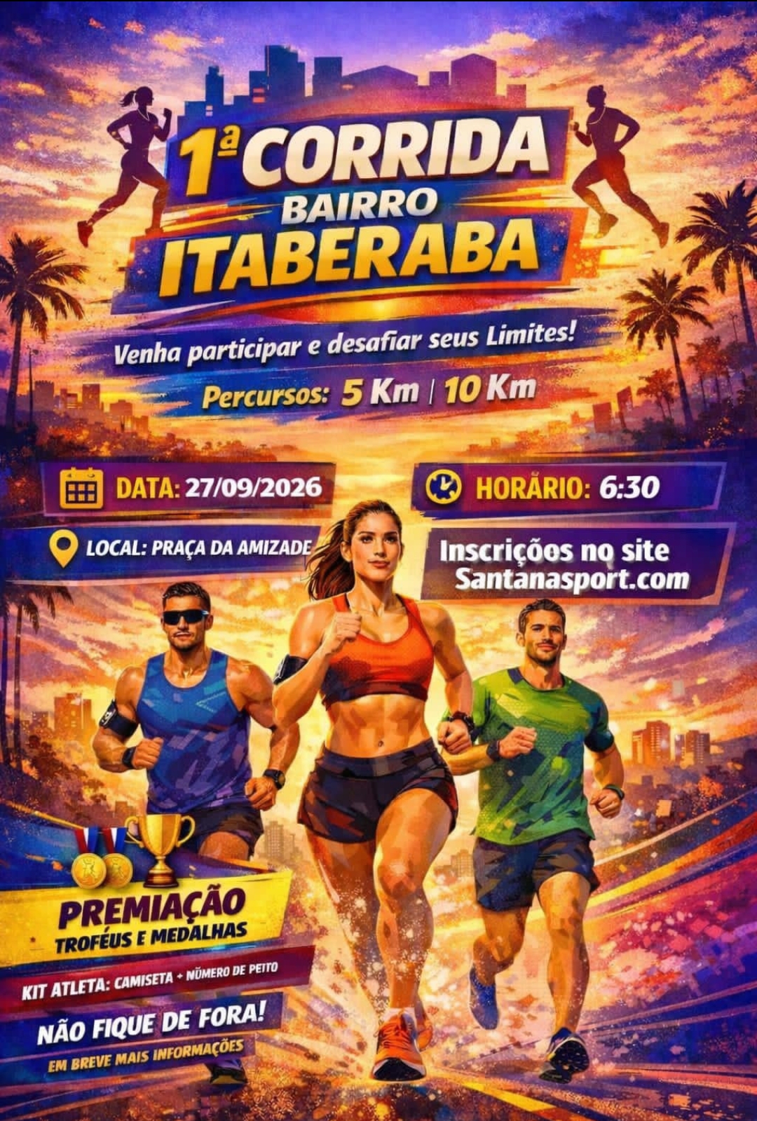 Art. 3º – O evento será realizado no dia 27 de setembro de 2026 (domingo), com concentração às 6h00 e largada prevista para as 6h30, contemplando um percurso de 5 km e de 10 km, passando pela Avenida São Francisco do bairro Itaberaba e finaliza na praça da amizade.