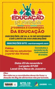 Este evento, denominado de “2ª Corrida e Caminhada Educação em Movimento” é uma organização conjunta da Secretaria da Educação do Estado da Bahia (NTE 10) e Secretaria Municipal de Educação de Juazeiro, com largada e chegada, no dia 23 de novembro de 2025, com largada ás 7 horas, na orla 2 de Juazeiro – BA, tendo como público-alvo, alunos, professores e servidores da Rede Estadual e Municipal da Educação.