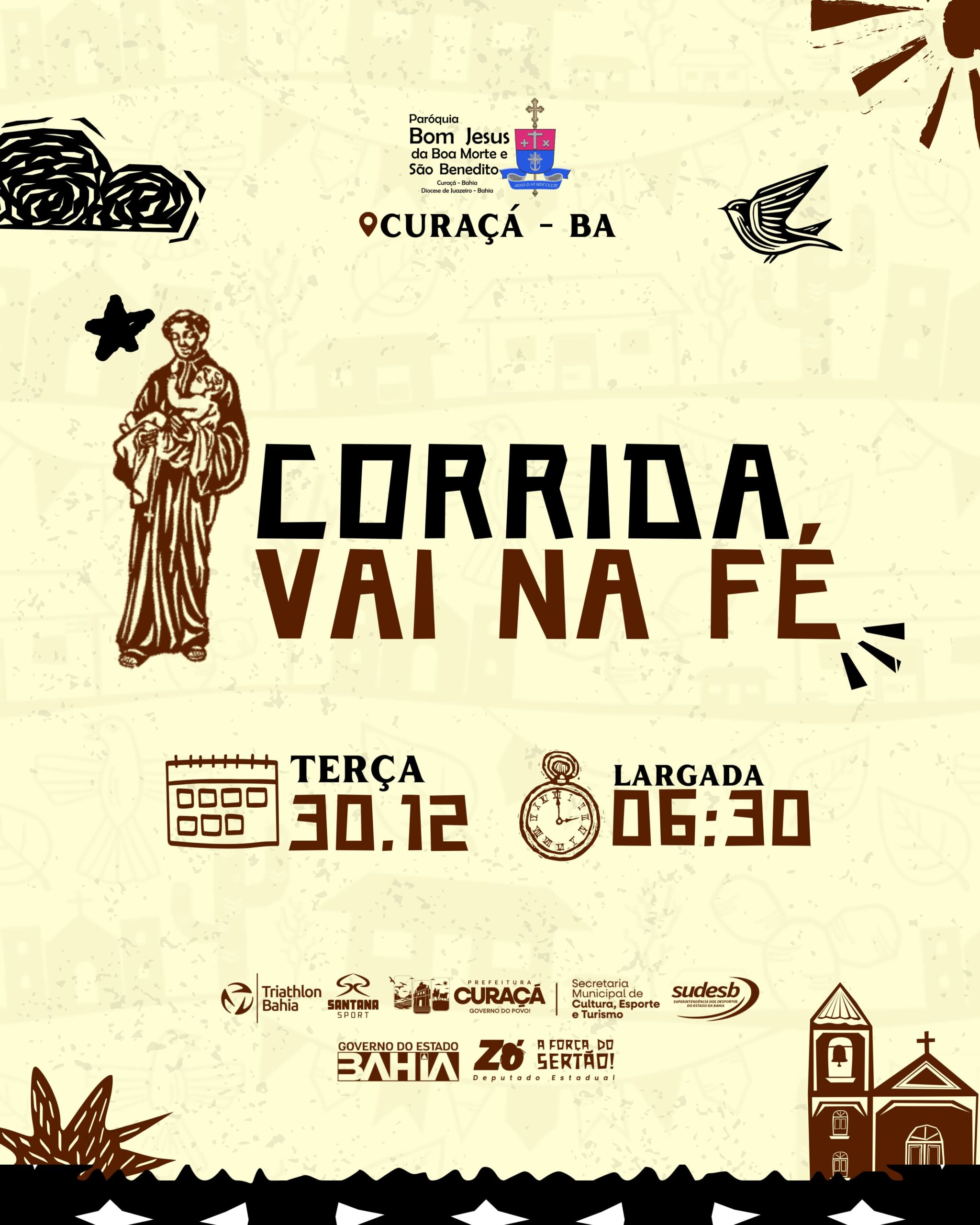 1.1 – A Corrida Vai na Fé, doravante denominada EVENTO, realizar-se-á no dia 30 de dezembro de 2025 (DOMINGO), com largada prevista para ás 06:30 horas, Cidade de Curaçá – BA, com participação de pessoas de ambos os sexos, devidamente inscritas, doravante denominadas de ATLETAS, sob qualquer condição climática. Faz parte deste EVENTO as CORRIDAS DE 5 KM e 10 KM.